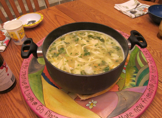After 45 minutes, we got the all clear and I did my best to whip together ingredients since we were pushed past bedtime. Though imperfect, we discovered a universal truth: Chicken soup is deeply satisfying. Do consider this curative whenever a friend is in need... or while a storm rages outside.